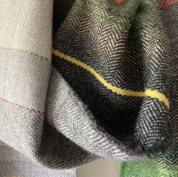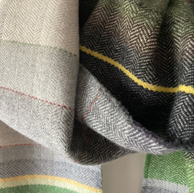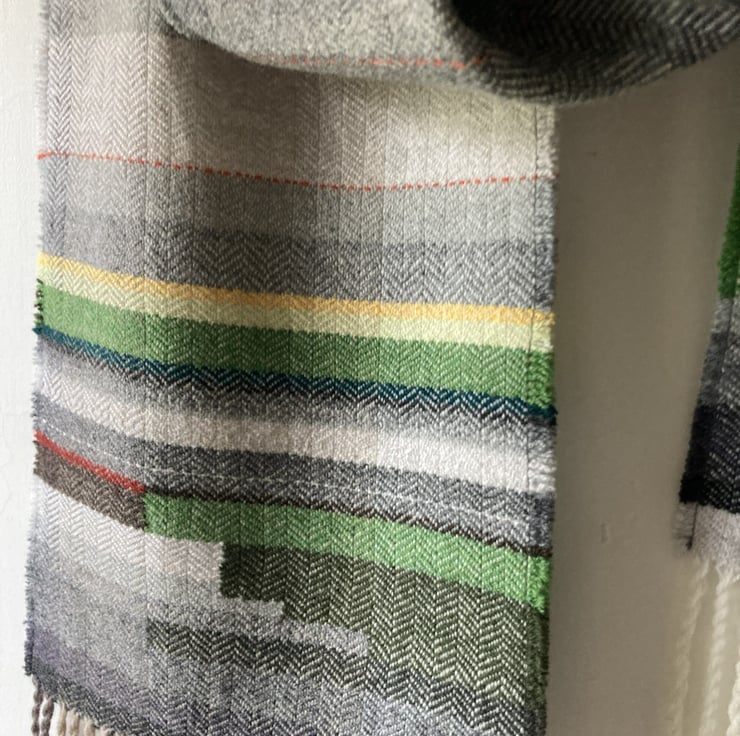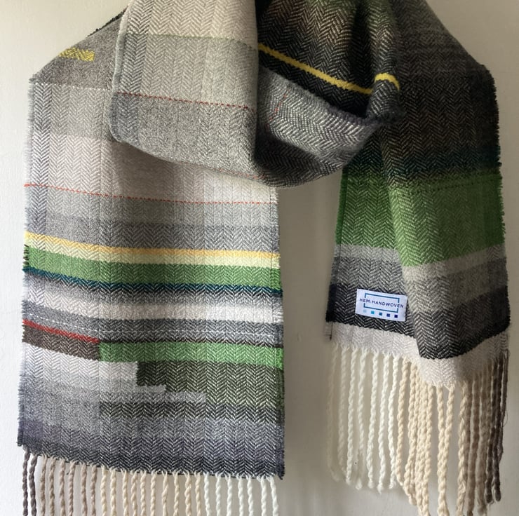 A unique scarf in shades of green. Handwoven on a gradient warp based on the geology of landscape, in this case, limestone grey. Woven in a classic herringbone from Yorkshire-spun non-mulesing lambswool, they are non-itching and very light and soft. This design is also available in shades of teal, blue, and heather.