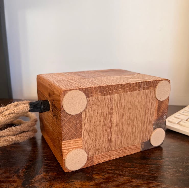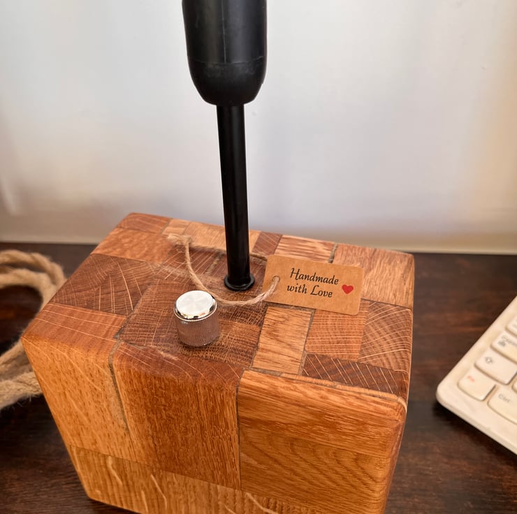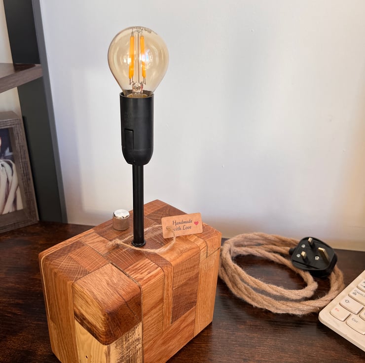 This unique desk lamp is handcrafted from oak board offcuts, carefully glued together to form a solid, character-filled wooden block. What began as leftover pieces of oak has been transformed into a striking country-rustic lamp, full of warmth, natural charm, and personality.
