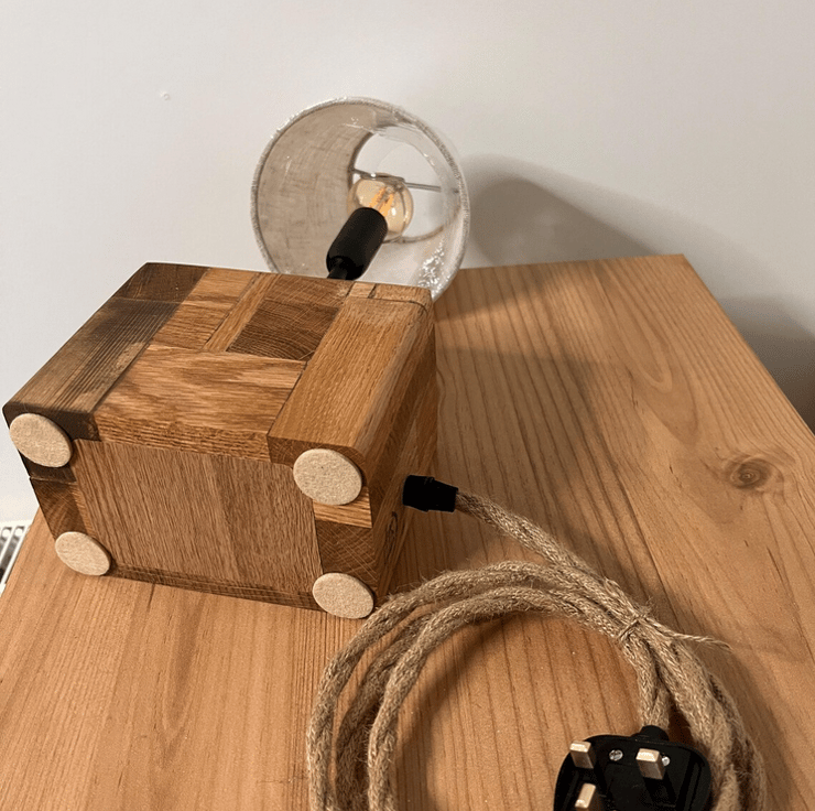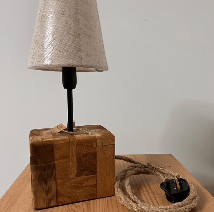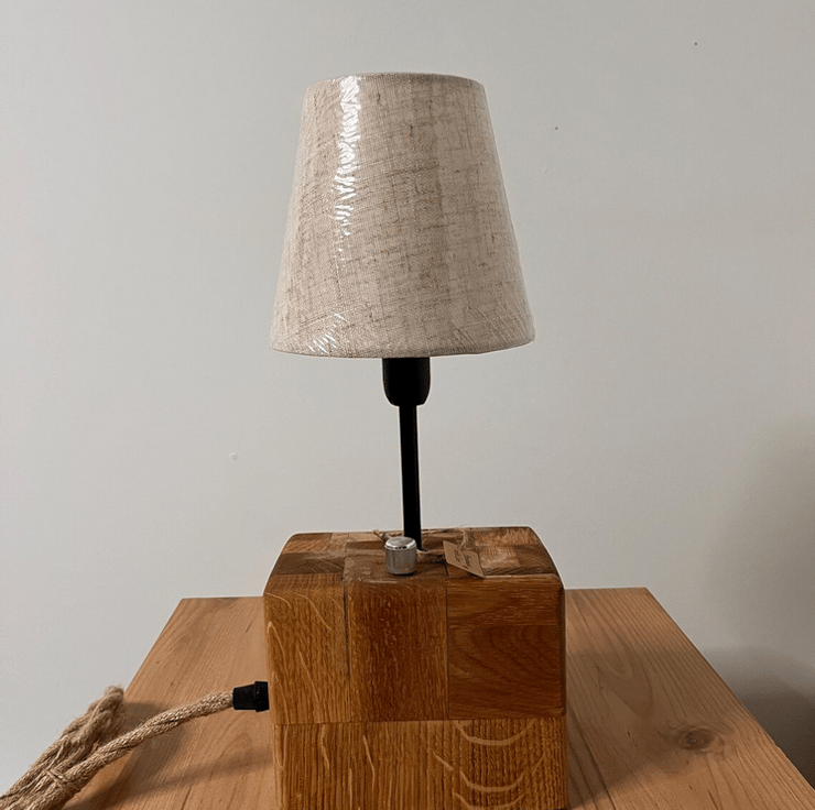Unique handmade desk lamp is crafted from oak board offcuts, carefully glued together to create a solid, character-filled wooden block. What began as leftover pieces of oak has been transformed into a beautiful country-rustic lamp, full of natural imperfections and charm.