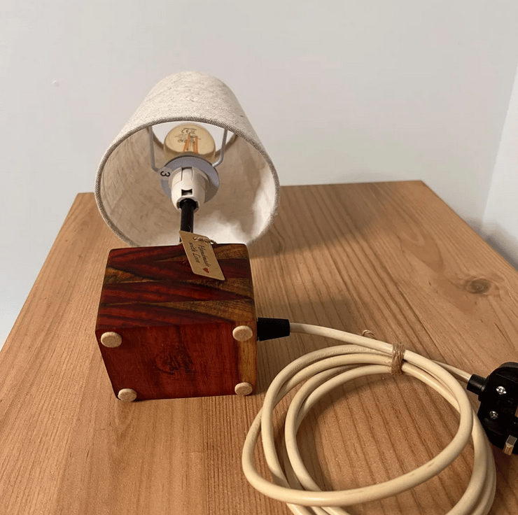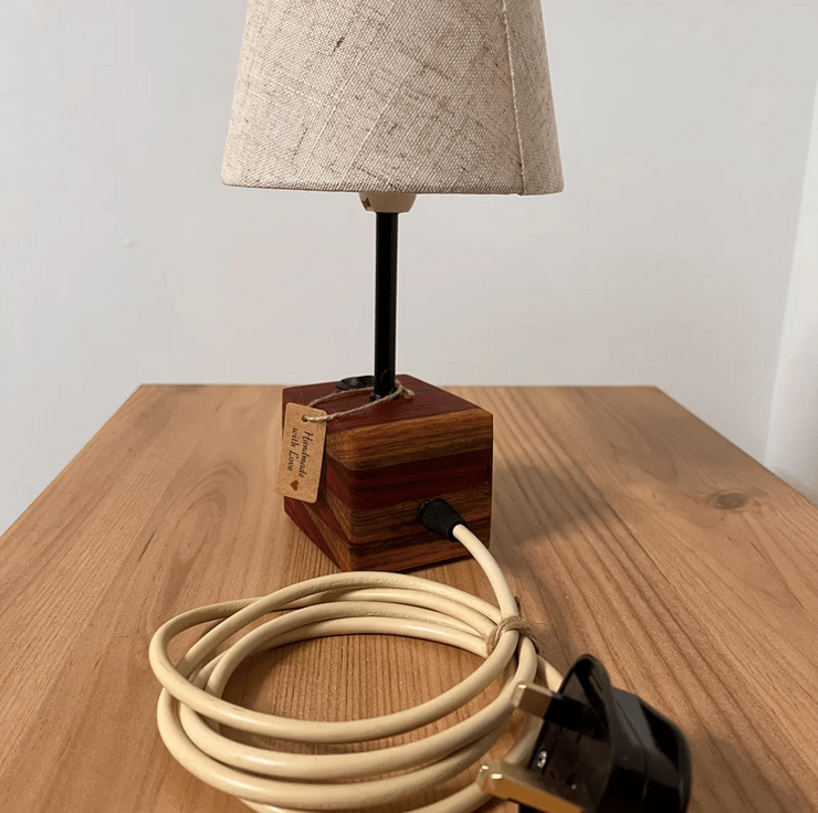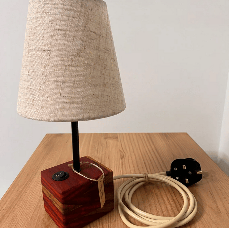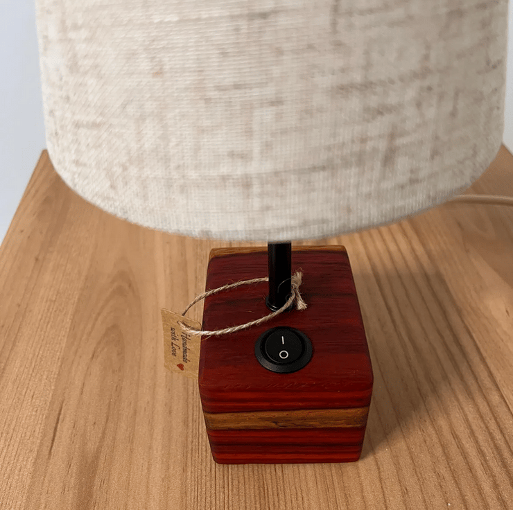 handcrafted Padauk wood desk lamp, made from a solid board that has been carefully glued into a single block to form a striking, natural base. The rich reddish tones of Padauk wood make this lamp a true statement piece, perfect for desks, side tables, or bedside use.
