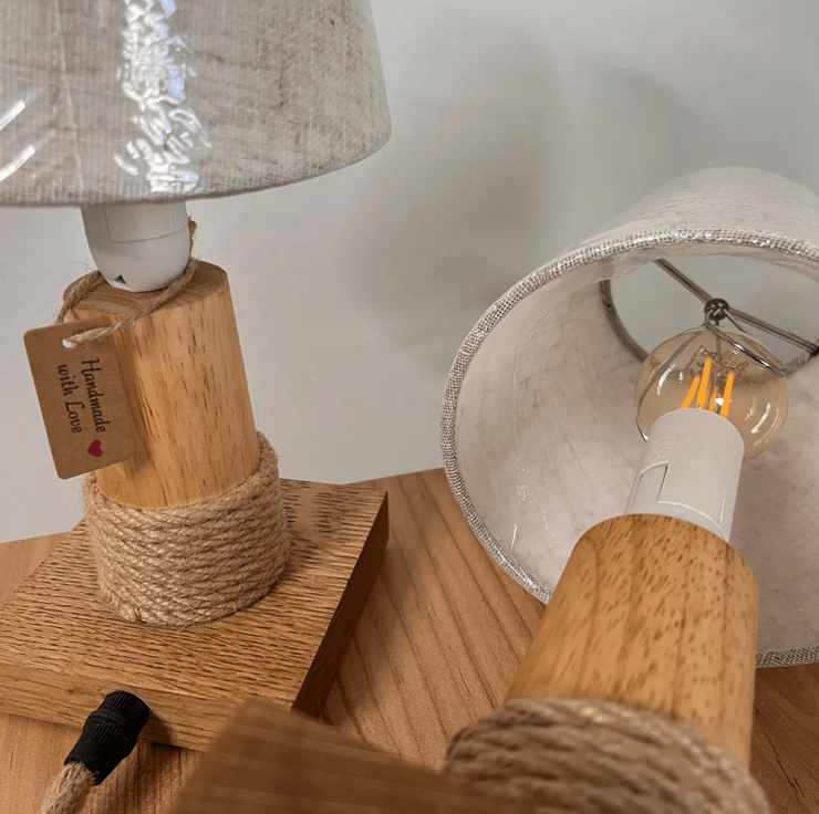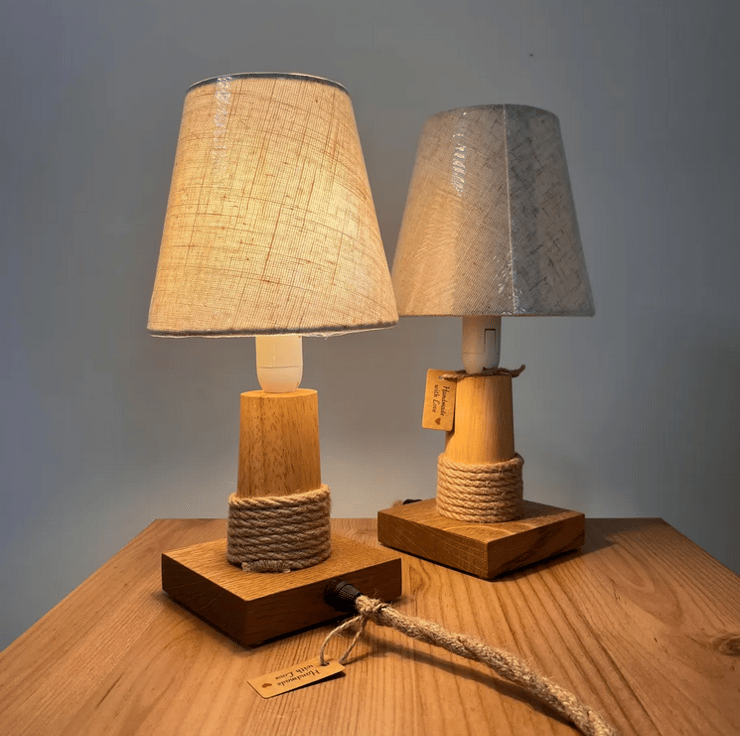 set of two handcrafted nightstand lamps made from natural rubberwood with a solid oak base. Their clean, minimalist design makes them a perfect fit for modern, Scandinavian, rustic, or Japandi interiors.