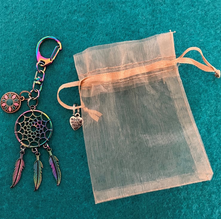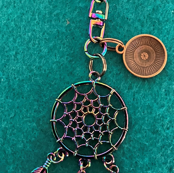 The dreamcatcher has three feathers, a bag clip and an additional round metal charm with a flower petal design in pink and teal.