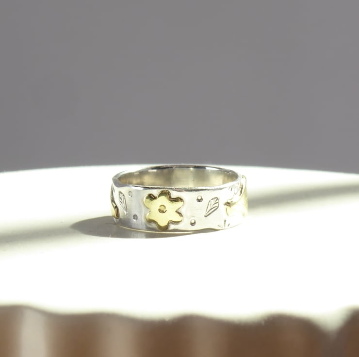 Brass flower and leaves dancing around the band with hand-engraved details.