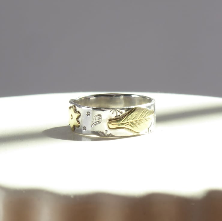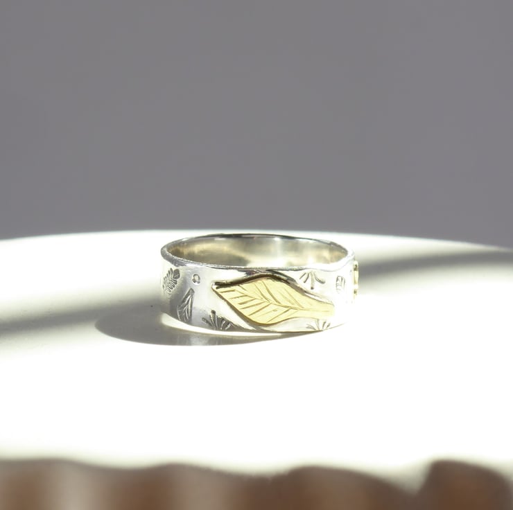 Handmade organic 925 silver band, hand-stamped grass, ferns and leaves.
