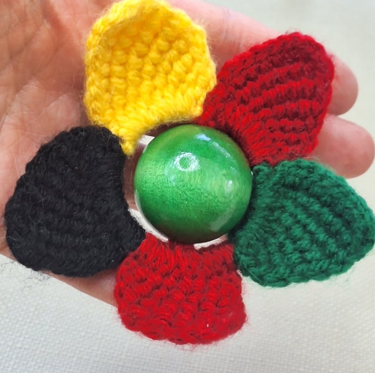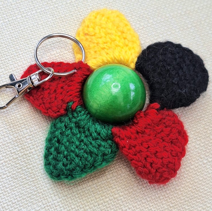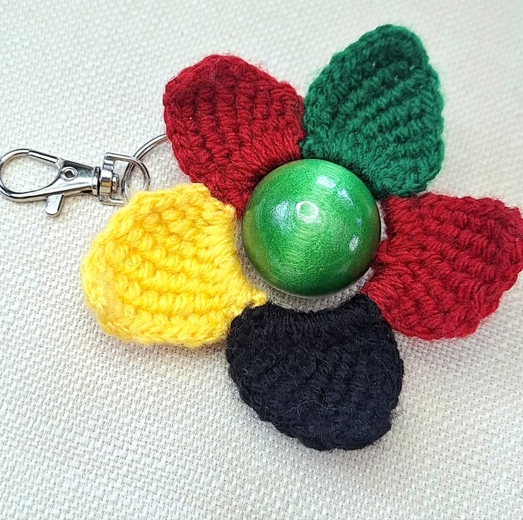 A striking floral keychain made with yarn petals crocheted around a recycled plastic bottle-cap ring using a Tunisian crochet-inspired technique. This keyring features petals in red, green, yellow, and black, with a green, 3cm wooden bead that I hand-dyed and varnished. Finished with a stainless steel keyring and lobster clasp, this chunky, tactile charm adds a bright touch of spring and summer to bags, keys, and backpacks.