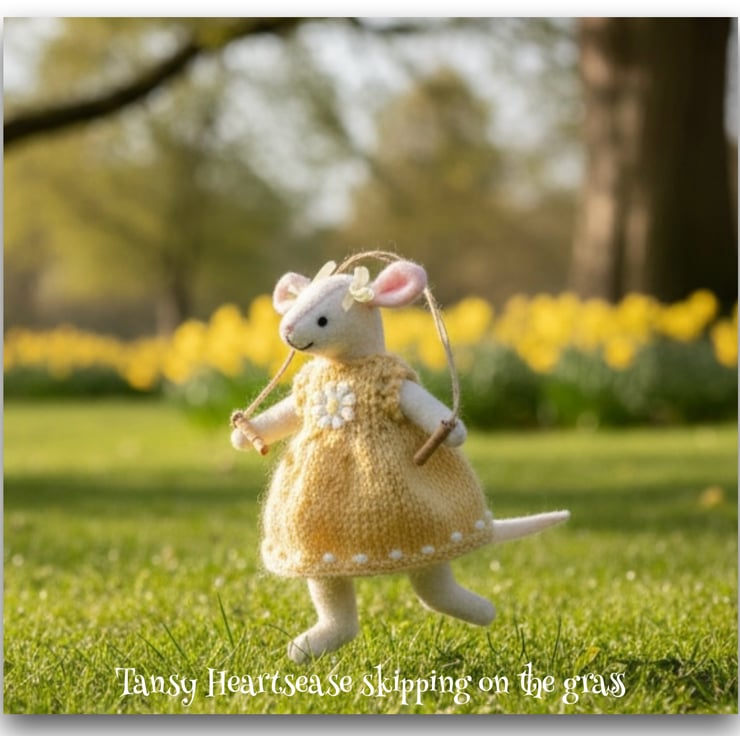 Tansy Heartsease, in her knitted and embroidered yellow dress, trimmed with a daisy, is a Pip Squeak, a young Little Nippers from Mulberry Green. Little Nippers are tiny wood mice who live in a maze of tunnels underneath the barn at Mulberry Farm. All of the Little Nippers are named after herbs and meadow flowers. Sets of clothes, made especially to fit them, are also available in my shop. Little Nippers are 12cm tall.