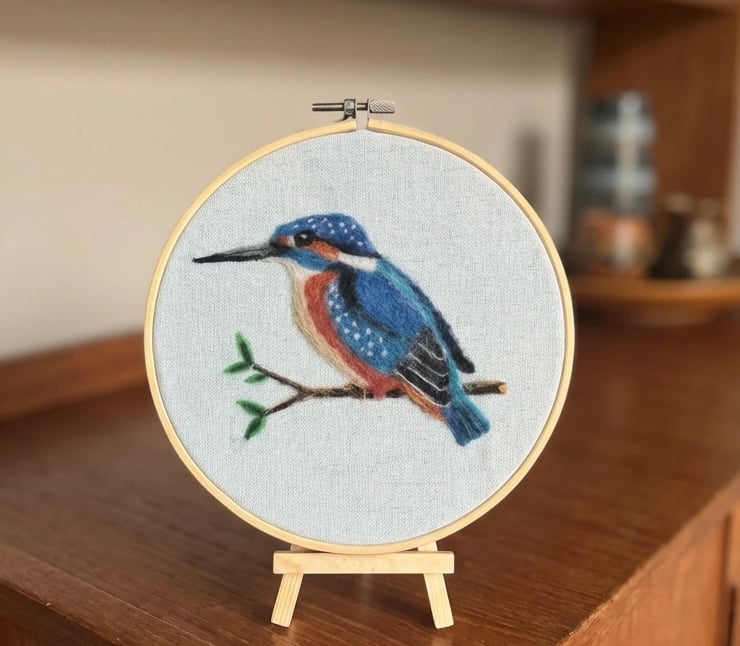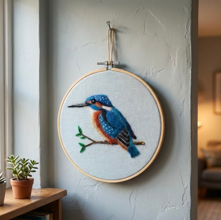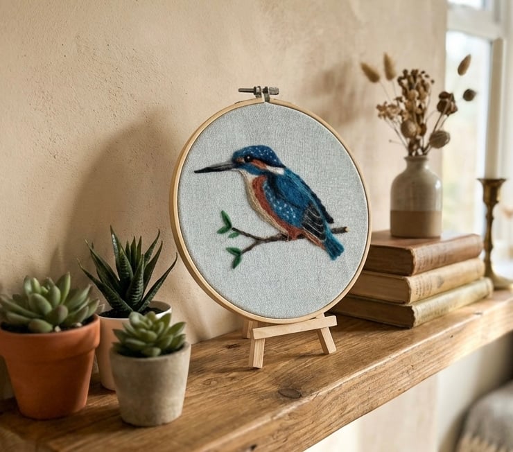 This Kingfisher has been carefully hand felted onto a linen background using traditional needle felting techniques. Displayed in a wooden embroidery hoop this piece is full of texture & charm. A lovely gift for bird watchers, cottagecore homes & anyone who enjoys wildlife decor.