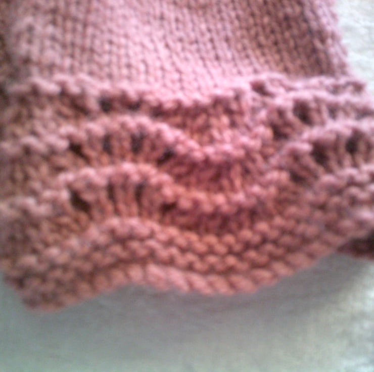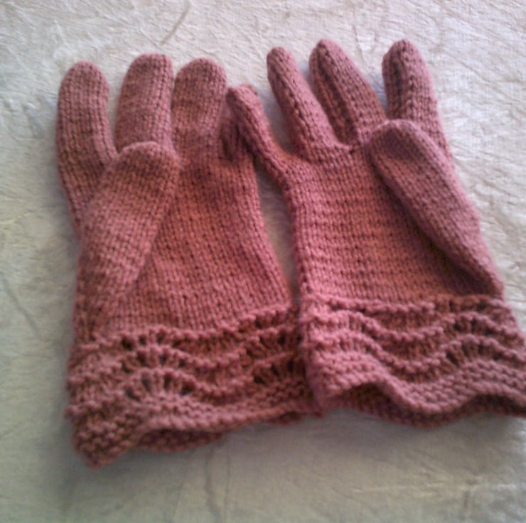 These handed knitted ladies gloves are made using acrylic yarn in a light rust brown and have a lacy design on the cuffs.