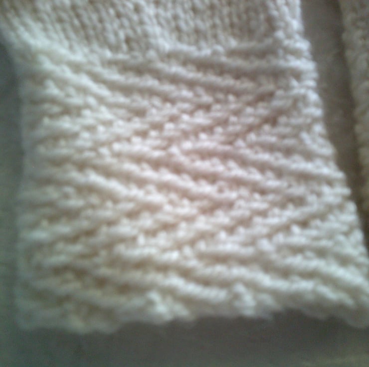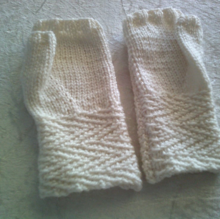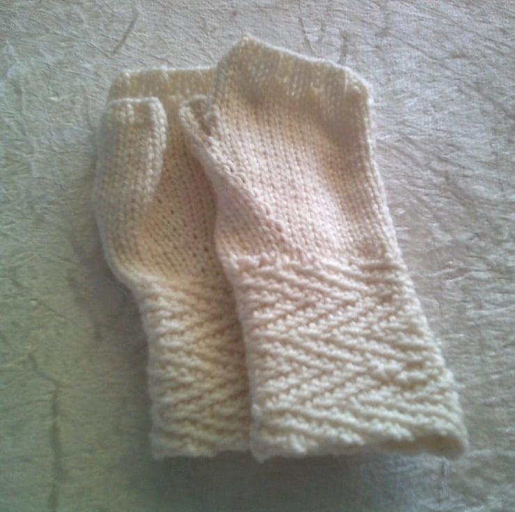 These handed knitted fingerless ladies mittens are made using cream Aran yarn and have a Zig Zag pattern on the cuffs.