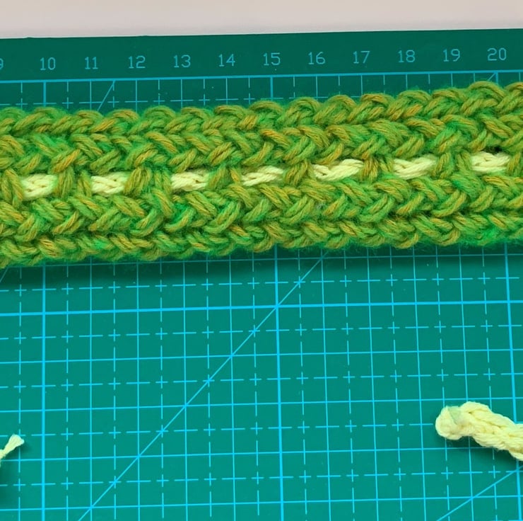 Hand knitted in the UK in a smoke and pet free environment. My own original design, adjustable as you tie to fit with the yellow handmade cord. The pattern on both sides is slightly different so two look in one item.