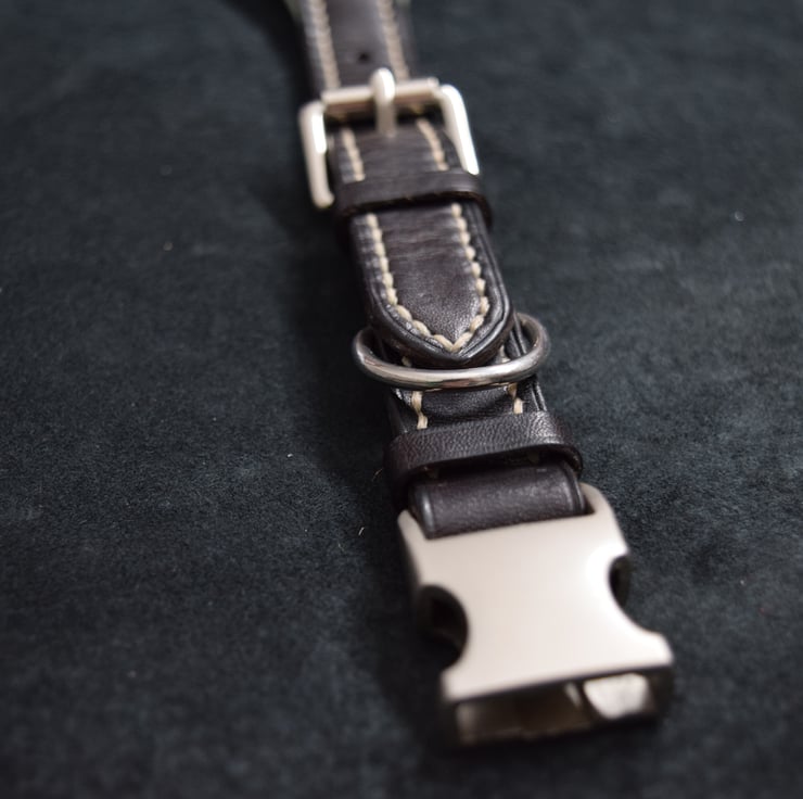This collar is fitted with a metal Alu-Max quick-release buckle, chosen for its reliability, clean design, and ease of use. It allows the collar to be put on and taken off easily, while remaining secure during everyday wear and lead use.