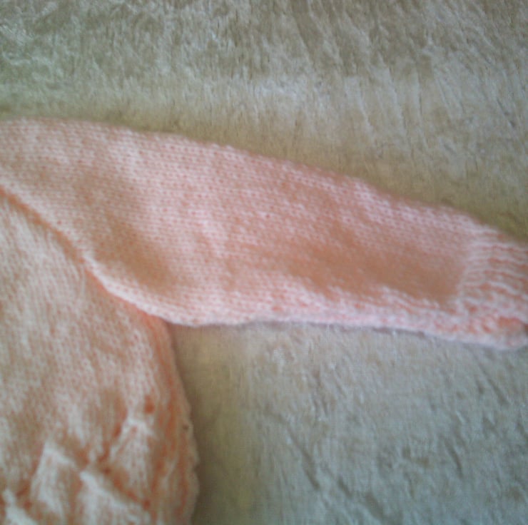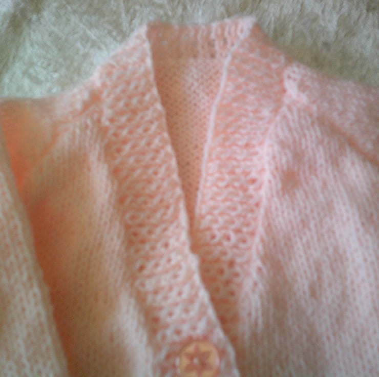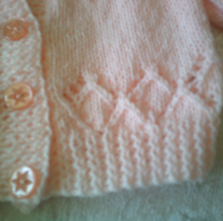 If is made in a peach coloured acrylic yarn and the design has a lacy panel around the bottom of the fronts and back and raglan sleeves. It is perfect for an extra layer to keep baby warm.