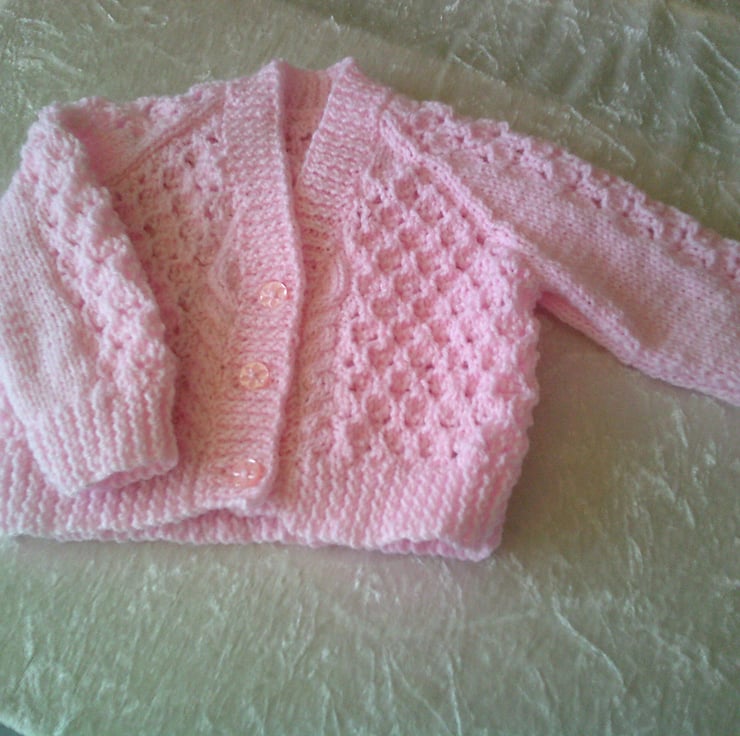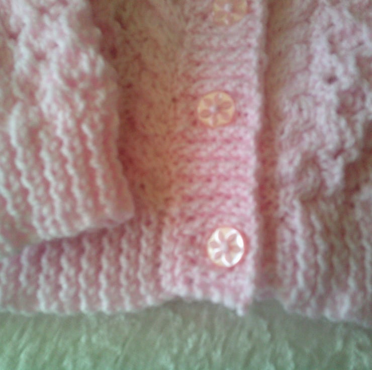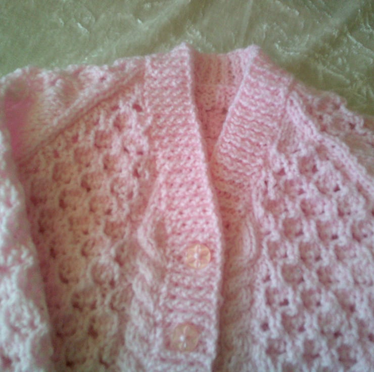 This hand knitted Pink V Neck cardigan is made using acrylic yarn and a design of lacy panels. It would make a lovely addition to a babies wardrobe.
