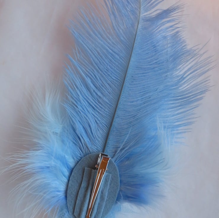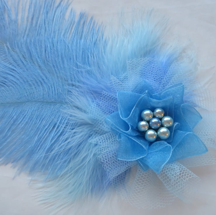 Handmade using two beautiful hyacinth blue ostrich feathers, layered with soft pale blue and hyacinth blue fluff feathers, the headpiece features a gathered panel of pale blue tulle, finished with a ruffle of shimmering hyacinth blue organza ribbon and a delicate cluster of pale blue pearls.