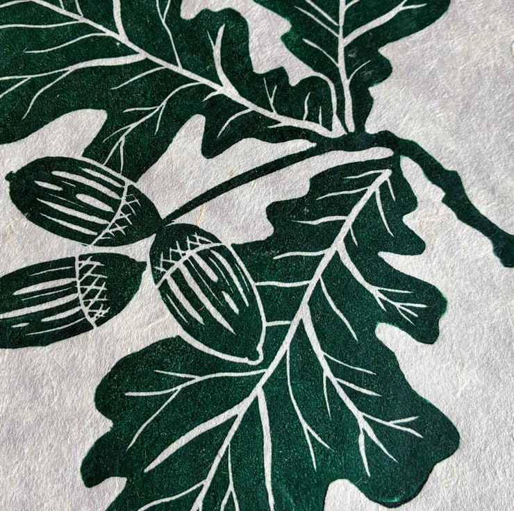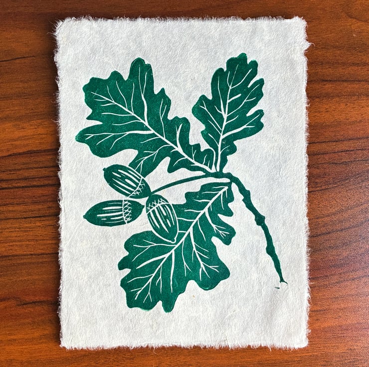 PERFECTLY IMPERFECT Oak leaf and acorn original linocut print in forest green