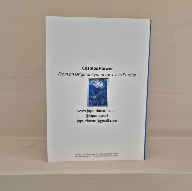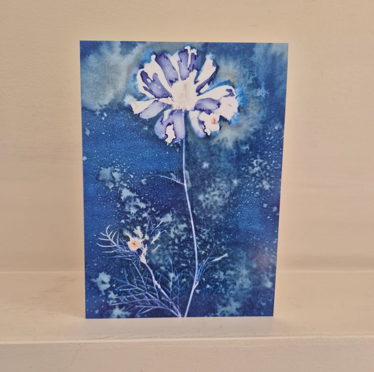 This greeting card, was reproduced from one of my original wet cyanotype prints, using a Cosmos flower from my garden.