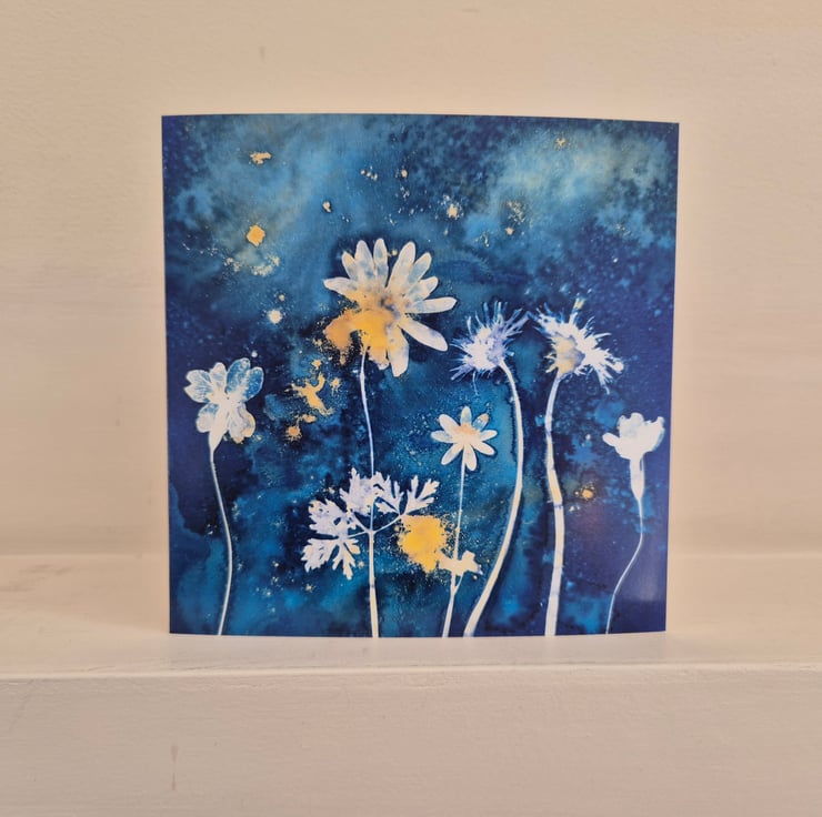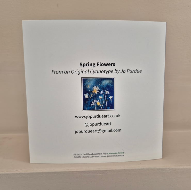 This greeting card called "Spring Flowers" was reproduced from one of my original wet cyanotype prints, created using flowers found in my garden in springtime.