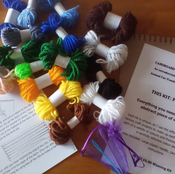 I had a huuuuge stash of yarn, in a rainbow of colours, leftover from various knitting projects. I remembered that when I was at school we often had fun found basic cardboard loom weaving, usually using packaging from cereal boxes. I decided that it would be fun to make up some basic weaving kits, as it's a very relaxing thing to do to unwind. As my shop is for animal themed arts and crafts, I opted to make the most up in fur and feather tones.