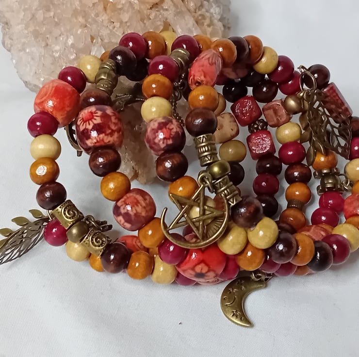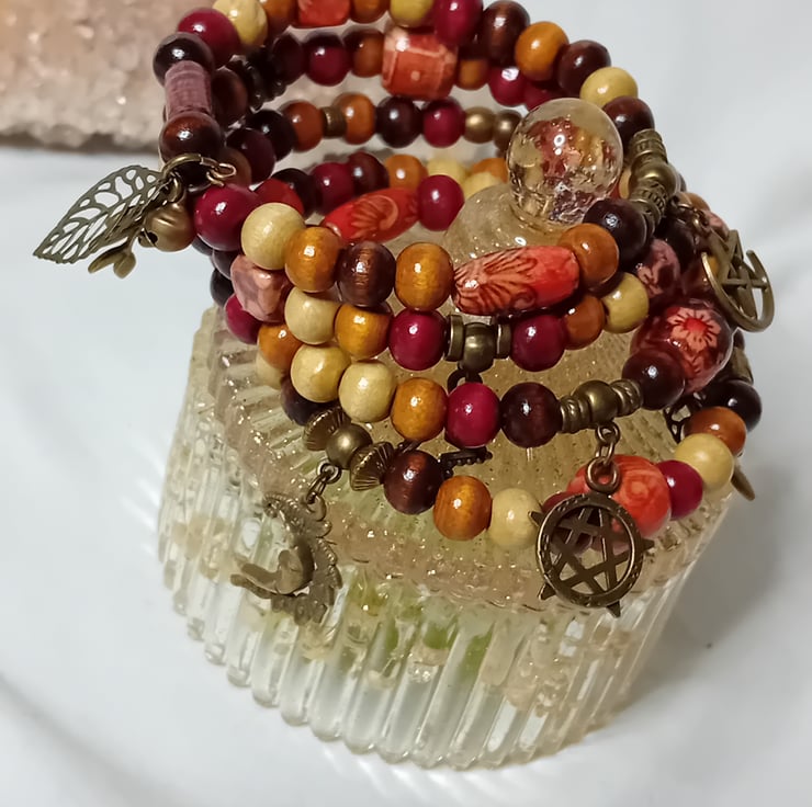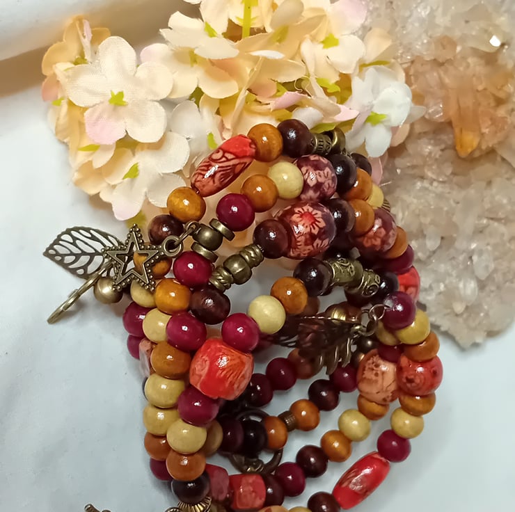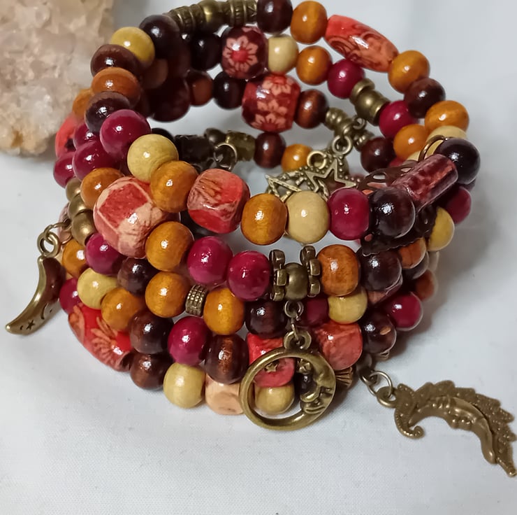 This bracelet is made with memory wire which gives the impression of stacked bracelets. This memory wire will fit anyone making it very versatile. The beads all vary in colours with Bronze embellishments and charms.