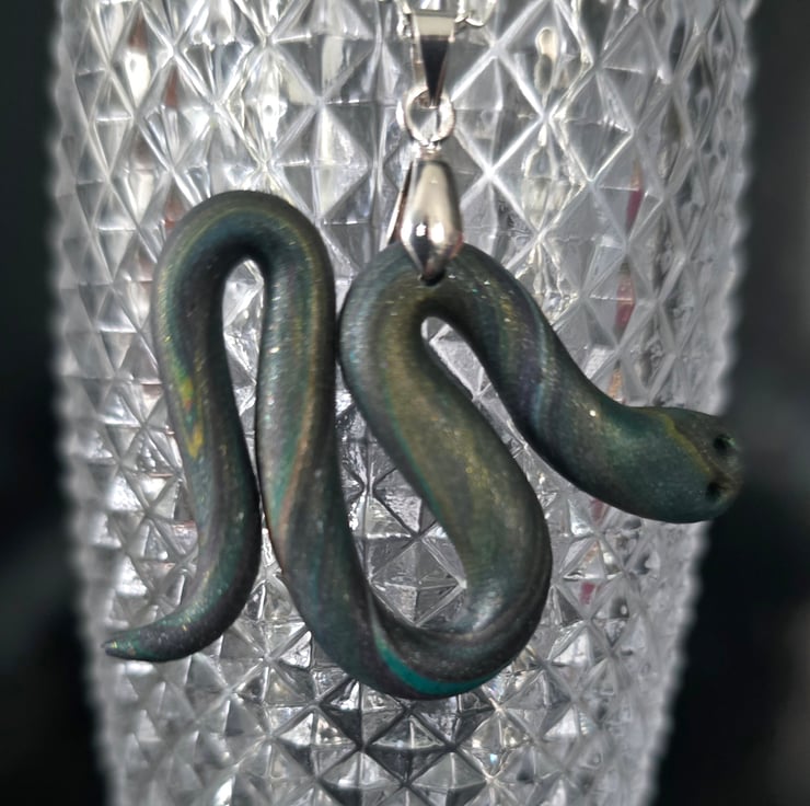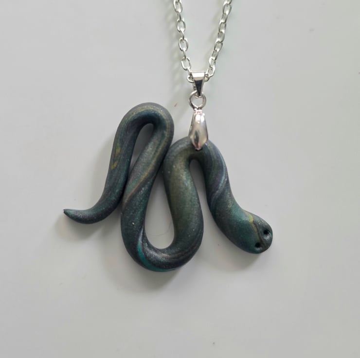 A snake necklace on a silver plated 18 inch chain and with a silver plated bail. Lovingly made with polymer clay. Presented in tissue and in an organza bag ready to gift to yourself or someone else.