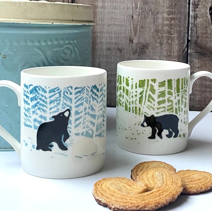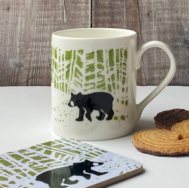 'Little Bear' is my earliest Lino print and still very much loved by my customers. I've adapted it so that the bear features twice on the wrap-around design, perfect for both left and right-handed folk. It's a very sweet medium-sized (8 floz/240ml) bone china mug, perfect for a coffee, tea or hot chocolate, is dishwasher safe and will be sent carefully boxed, ready to give... and be cherished! Perfect given as a pair alongside my 'Stargazey Bear' mug. (Coaster not included but available separately.)