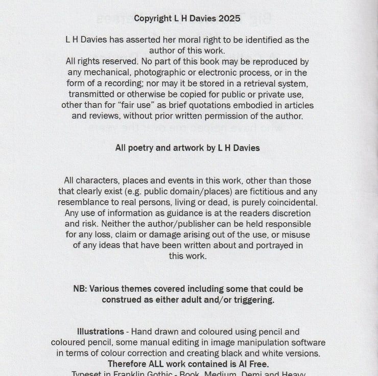 Work includes the following materials - Canon ink - Black, Magenta, Cyan and Yellow/ 100% recycled white paper/ Waxed silver thread/ Brown, cover paper (180gsm) and further postage/packaging may include - acid free white tissue paper, expandable large letter rigid cardboard envelopes and/or recycled postage bags. Disclaimer/s and copyright information etc., as standard, is included on copyright page at the front of the book. I am not aware of any risks associated with this product and/or packaging.