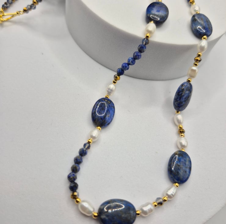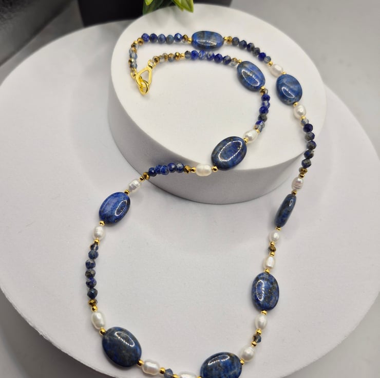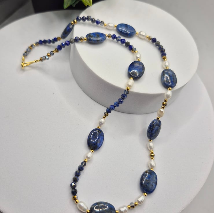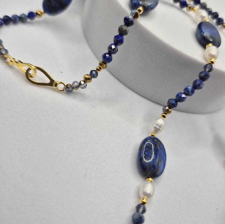 A beautifully handcrafted lapis lazuli necklace designed with elegance and wearability in mind. This timeless piece combines rich, undyed lapis lazuli gemstones with soft freshwater pearls and warm gold-plated sterling silver accents.