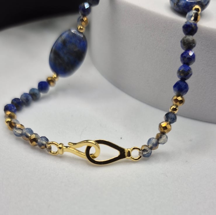 The necklace features 15x10mm oval lapis lazuli beads, 4mm faceted round lapis, 6x5mm freshwater pearls and delicate cornflower blue electroplated rondelles, all gently highlighted with 2mm gold-plated sterling silver beads. It fastens with a secure 925 sterling silver gold-plated hook and loop clasp.