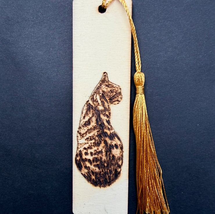 Tabby cat image burned by hand, using a pyrography (wood burning) pen, on to a 3cm x 12cm wooden bookmark, with a gold coloured tassel.