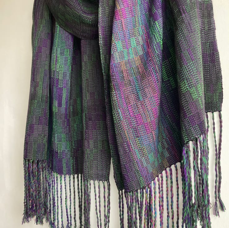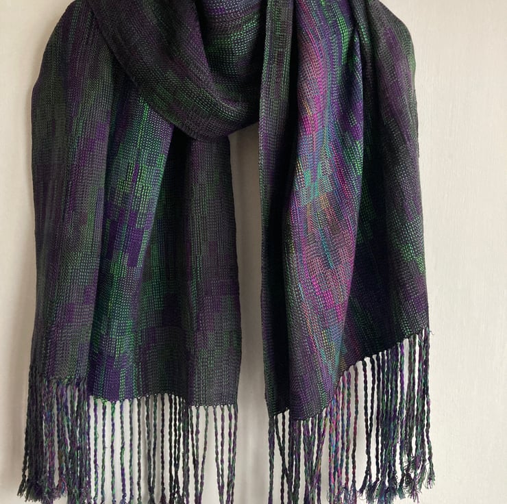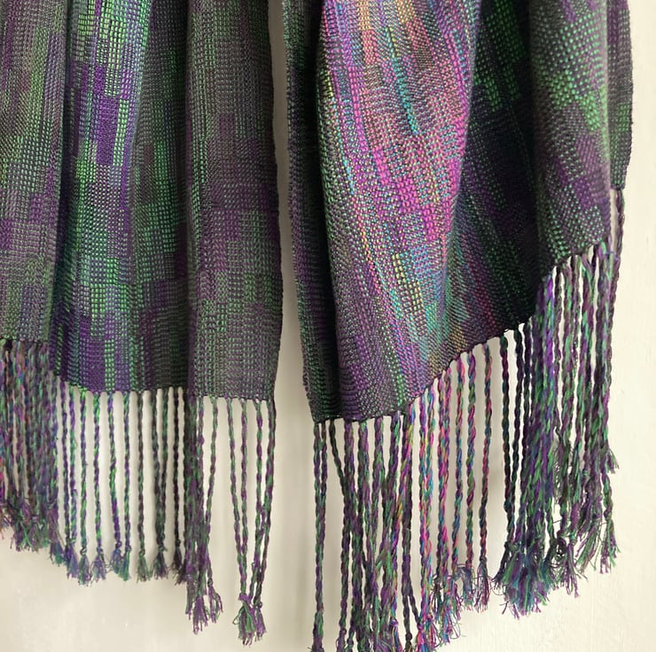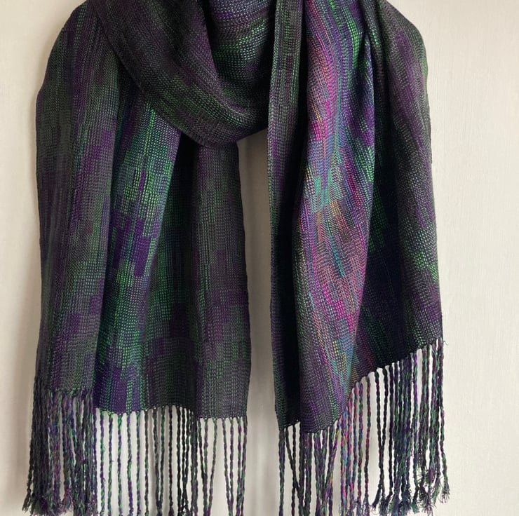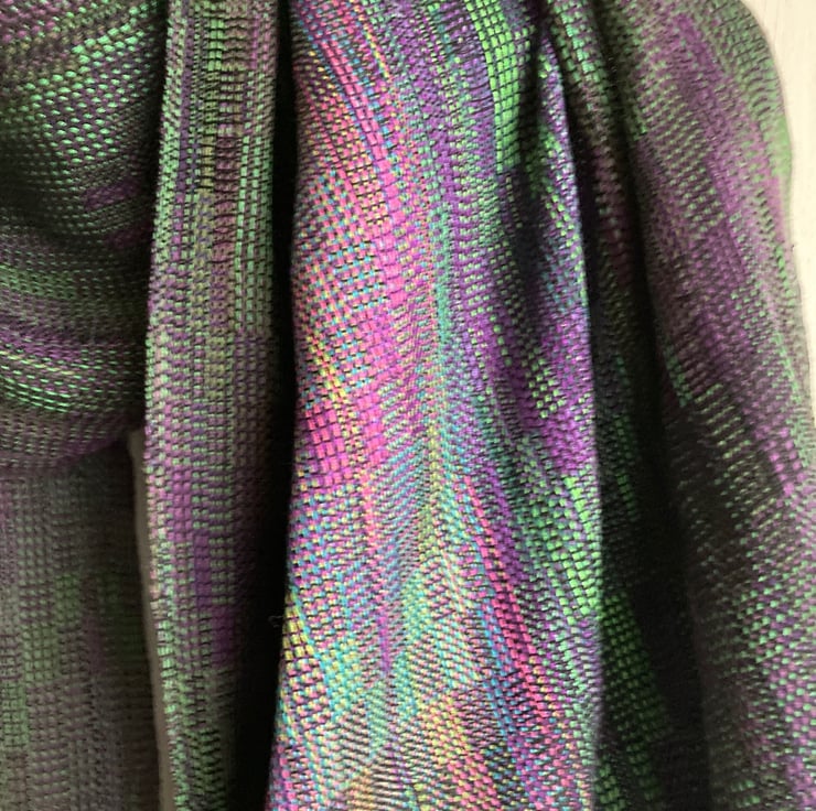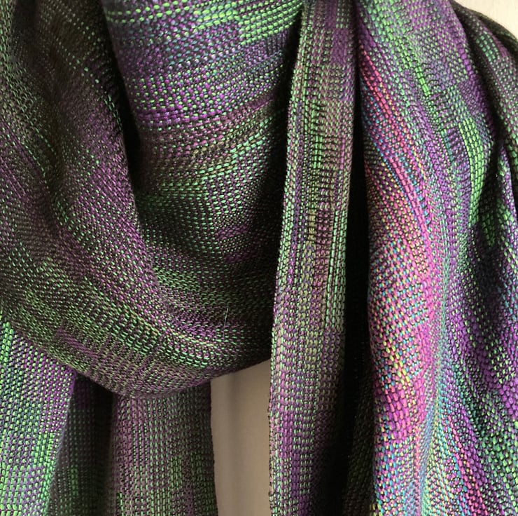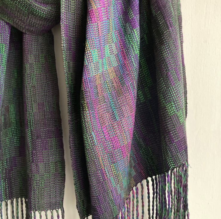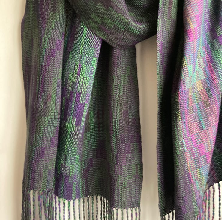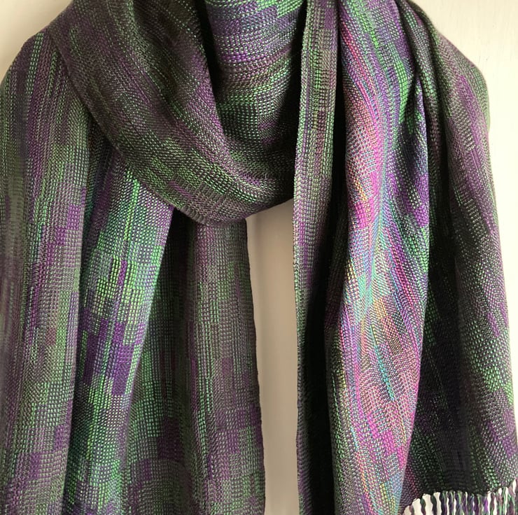A rich wide wrap scarf woven in an echo weave, in shades of purple and green. The warp is wound from silk and very fine Pima cotton in an intricate parallel-threaded advancing twill. A labour of love, taking 10 days to make, the scarf is carefully designed and handwoven in the finest very fine yarn. Inspired by irises in my garden, the shades become more vibrant towards the centre of the wrap, creating visual drama and a sense of movement.