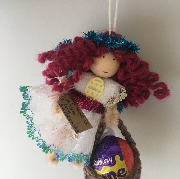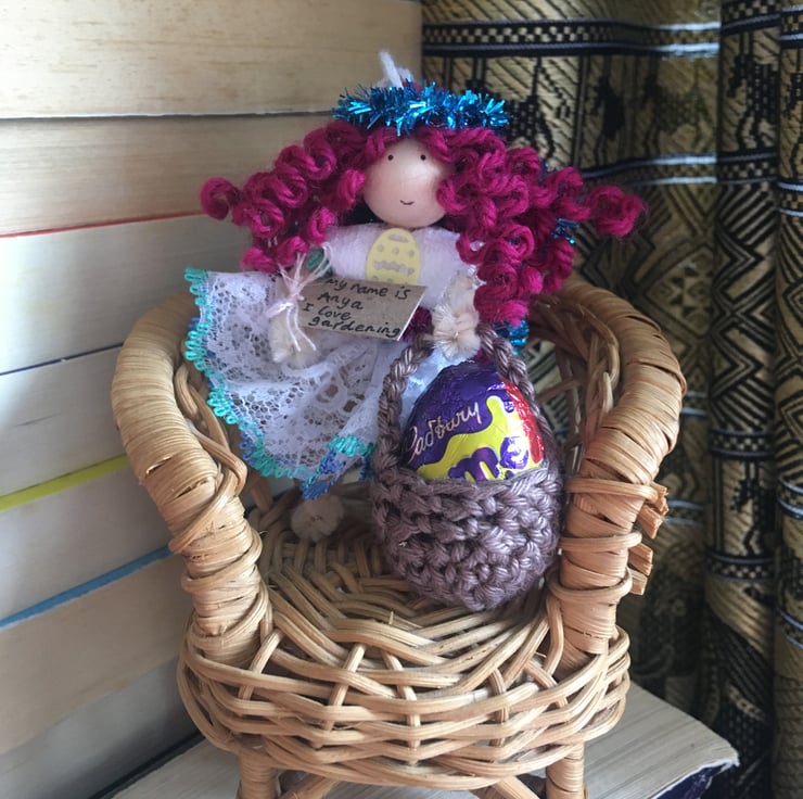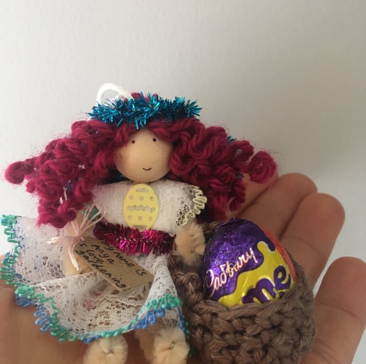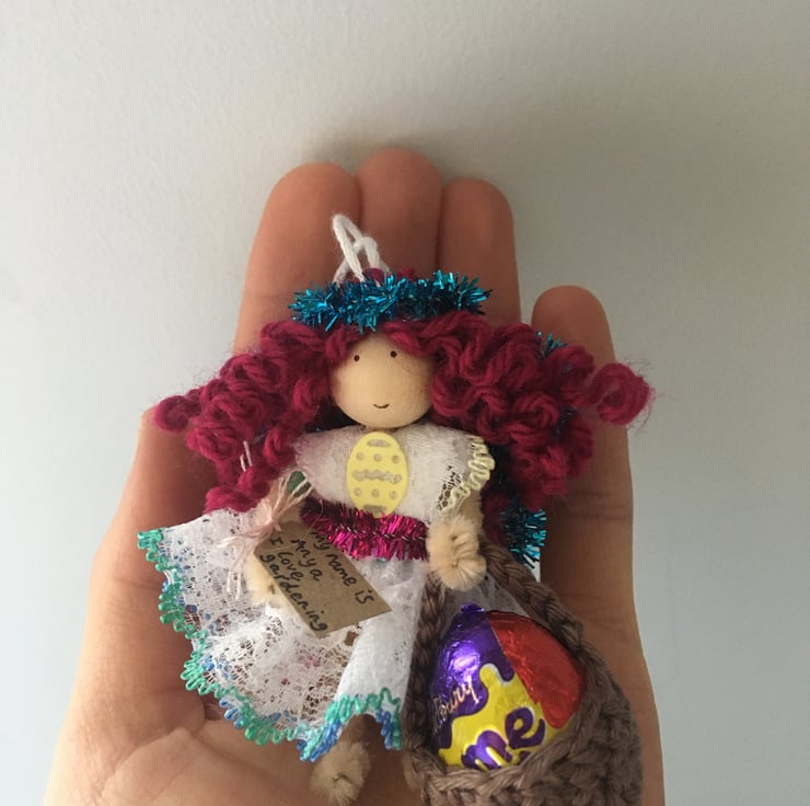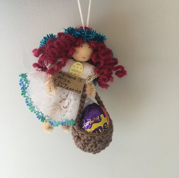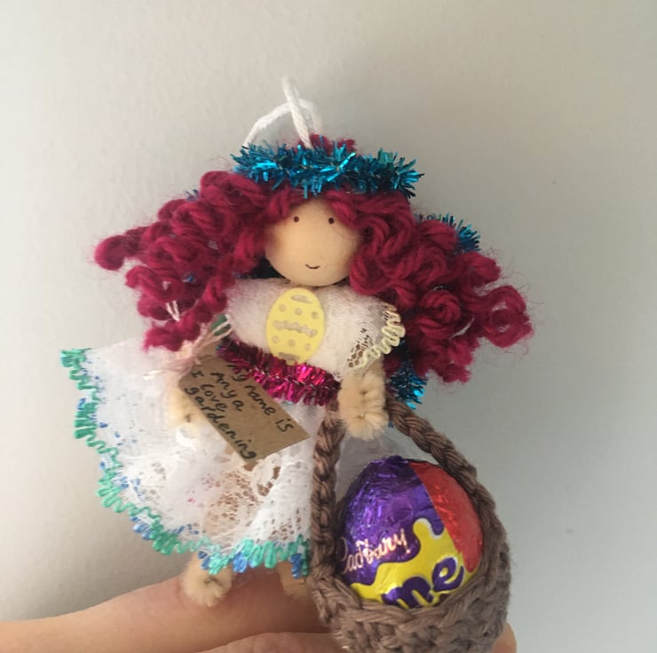 She has a little crochet basket. I am sorry, but the fairy DO NOT come with chocolate egg, it is just for show in the pictures!
