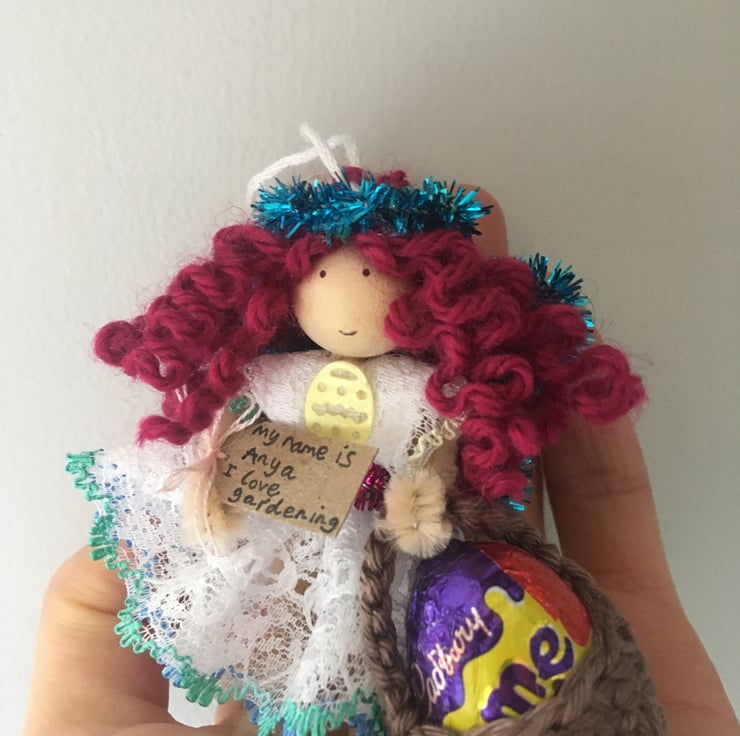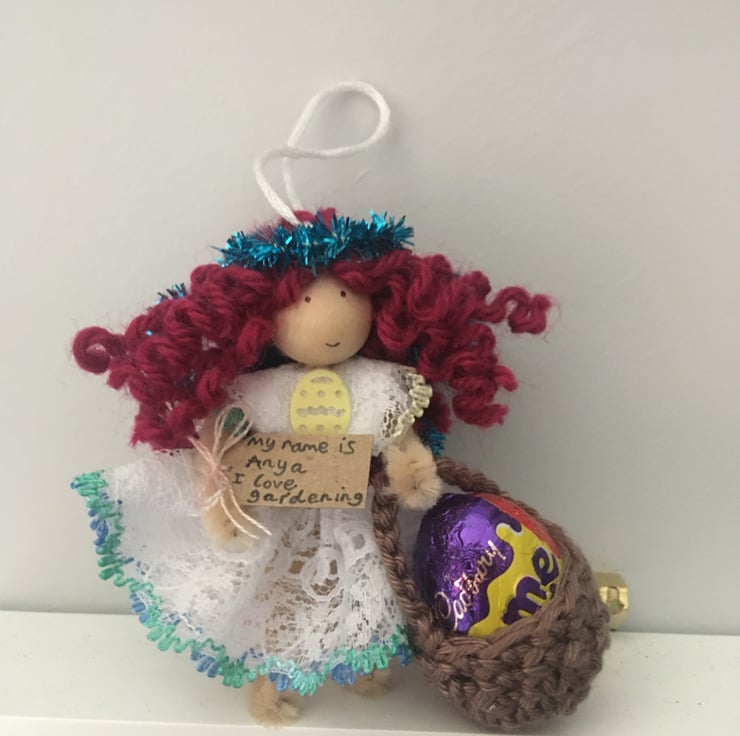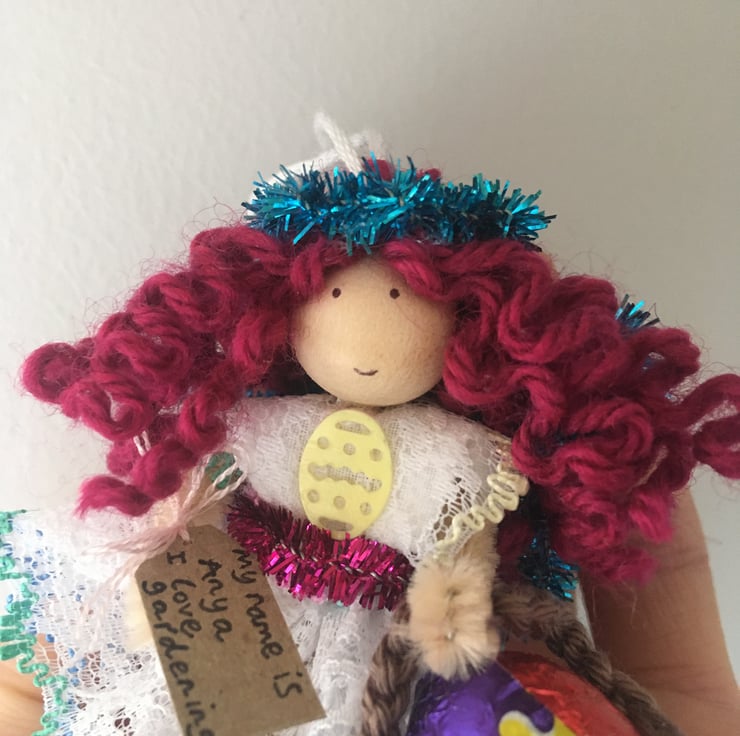 She has a tag which states her name and something that she loves. This little fairy is called Anya and she loves gardening.
