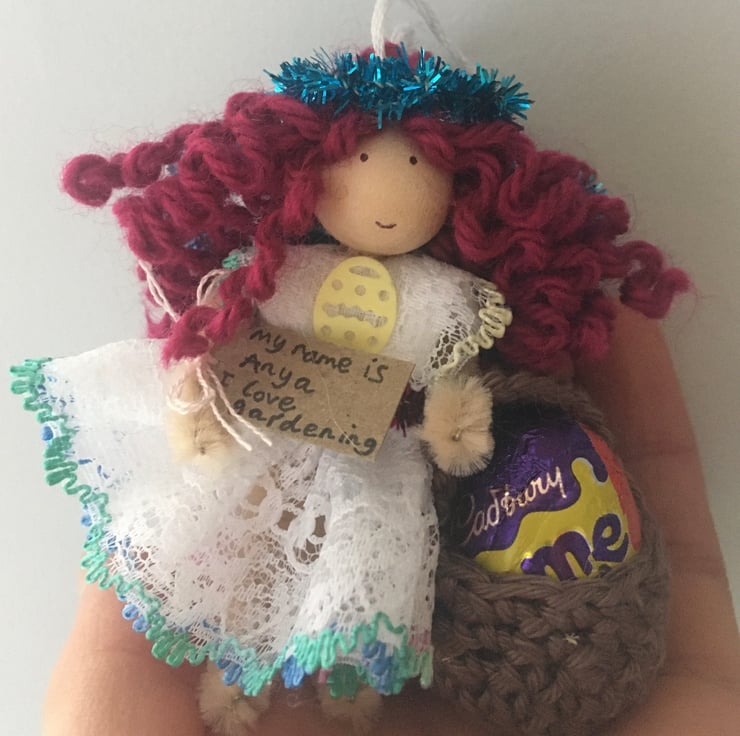 She has a tag which states her name and something that she loves. This tiny fairy is called Anya, and she loves gardening.