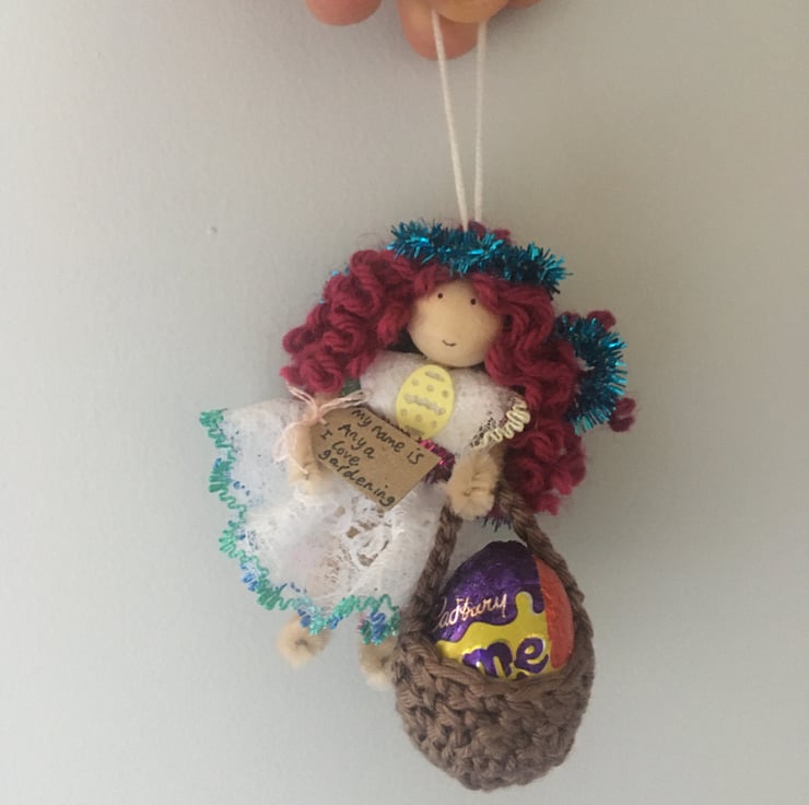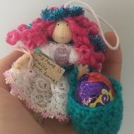 This tiny fairy has a little crochet basket. I am sorry, but the fairies DO NOT come with chocolate eggs, they are just for show in the pictures!