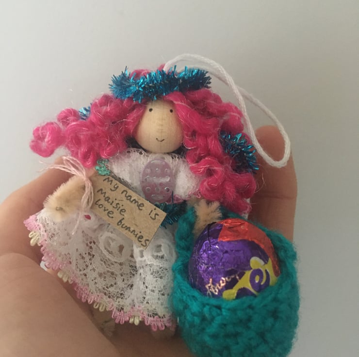 This tiny fairy has a little crochet basket. I am sorry, but the fairies DO NOT come with chocolate eggs, they are just for show in the pictures!