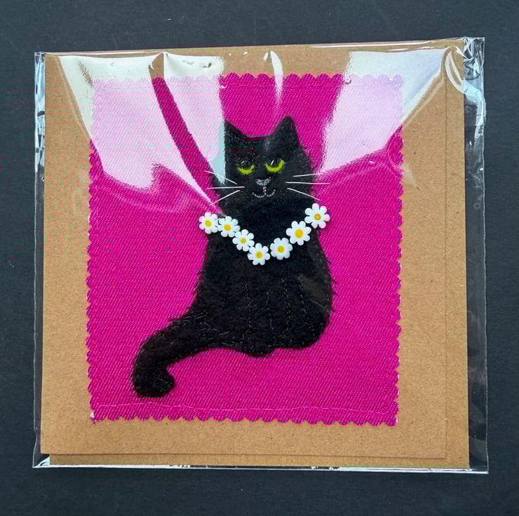 Wool felt black cat with a daisy chain necklace free motion embroidery picture on pink denim, stitched on to a 13.5cm square 300gsm recycled Kraft card. The item includes a matching Kraft paper envelope and a gold coloured self-adhesive paper seal, in a biodegradable clear bag.