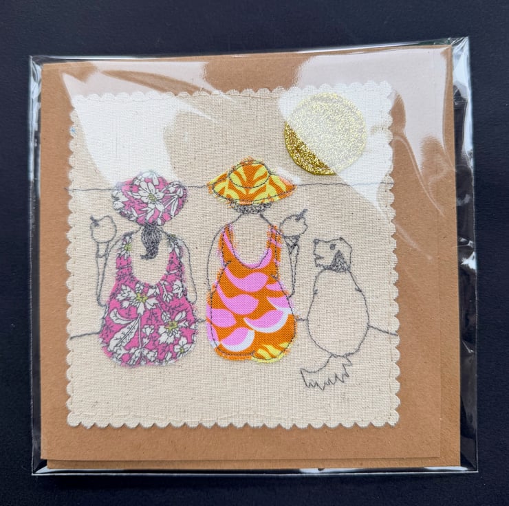 Two free motion ladies in printed cotton costumes and hats, and a free motion dog trying to eat the ice cream, on a calico background, stitched on to a 13.5cm square 300gsm recycled Kraft card. The item includes a matching Kraft paper envelope and a gold coloured self-adhesive paper seal, in a biodegradable clear bag.