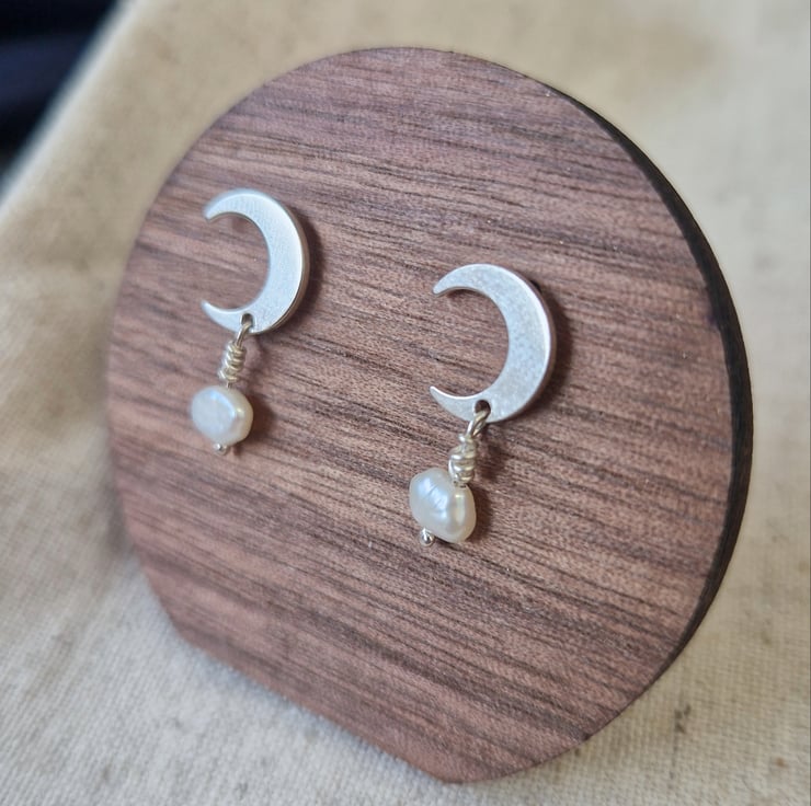 Silver stud crescent moon earrings Freshwater pearl detail Perfectly imperfect