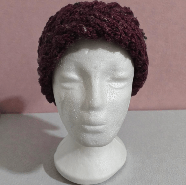Here is a lovely wine coloured cable pattern head band super chunky the circumference is 55 cm fits average ladies head made from good quality chunky wool