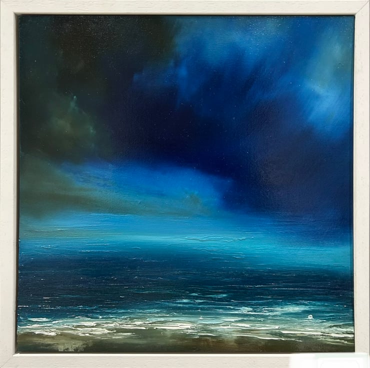 Framed in a solid white wood tray frame, ready to hang with back fastenings. Alternatively, this will stand alone on a shelf or mantle piece.