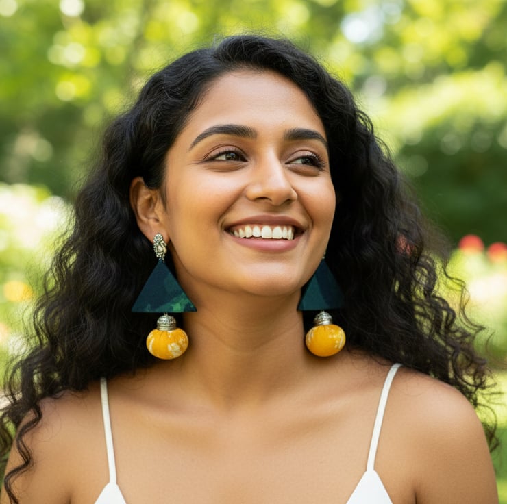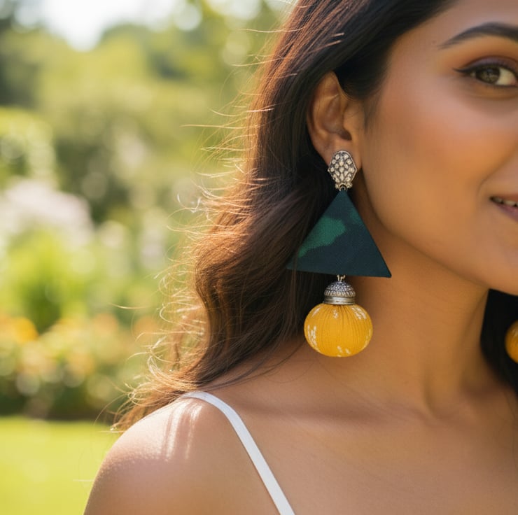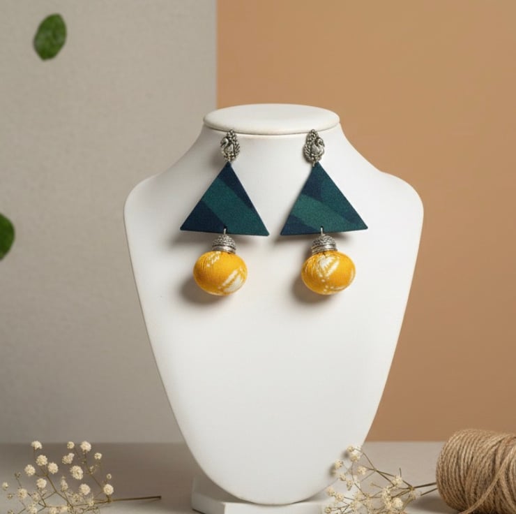 Bold, modern, and full of personality . These handmade statement earrings feature a green fabric triangle with abstract detailing, paired with a textured silver-tone stud and a marbled yellow bead drop.