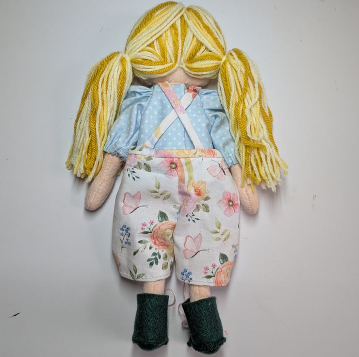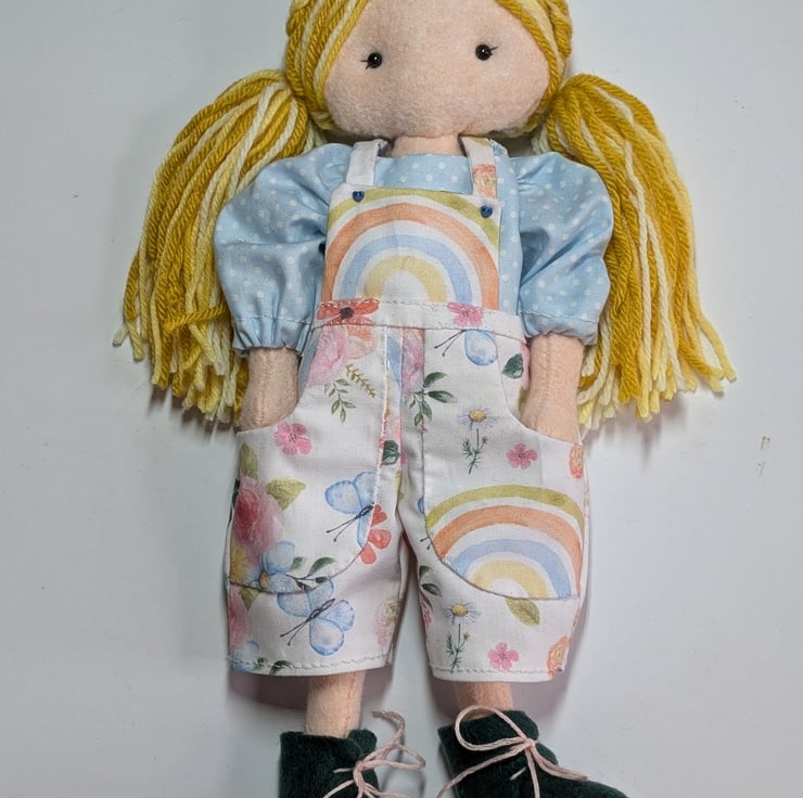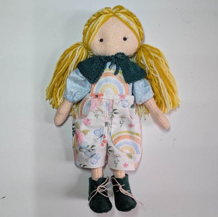 She is a unique handmade felt dolly, wearing a beautiful hand-sewn blouse and gorgeous floral/rainbow pattern dungarees. Her yarn hair is fastened in pigtails with braid details. Her outfit is completed with little felt boots and a hand knitted shawl.