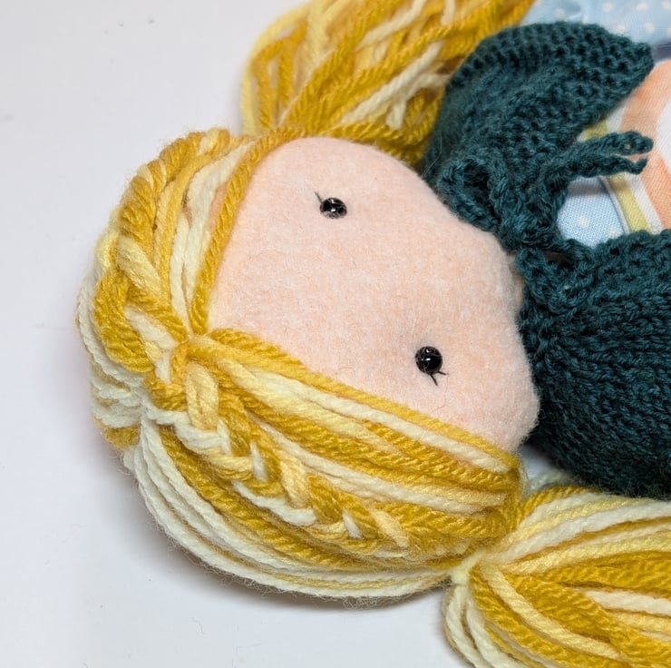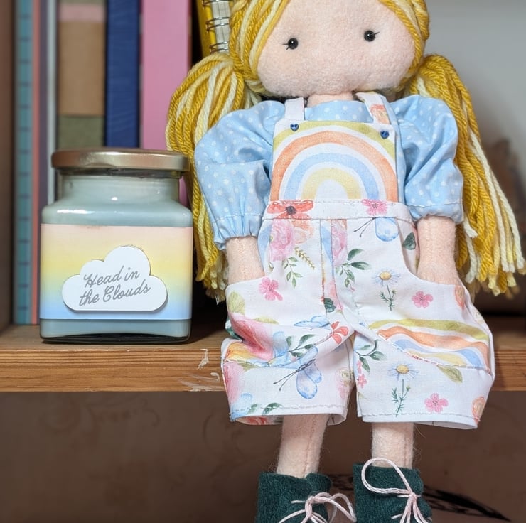 I was inspired to make Blossom by the hope of spring! I have had the dungarees fabric for a while, just waiting for the perfect time to use it. The sun has started trying to push through the clouds here in North Wales, there have been a few rainbows through the rain. Seeing them reminded me of this fabric I had in my stash and I realised it would make amazing dungarees! I used the dark green for a her shawl and boots as a reminder that there could still be some chilly weather ahead!