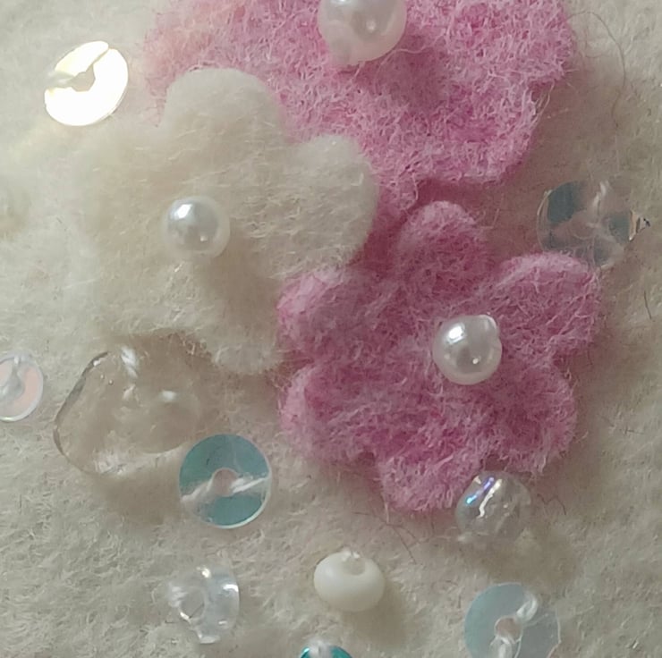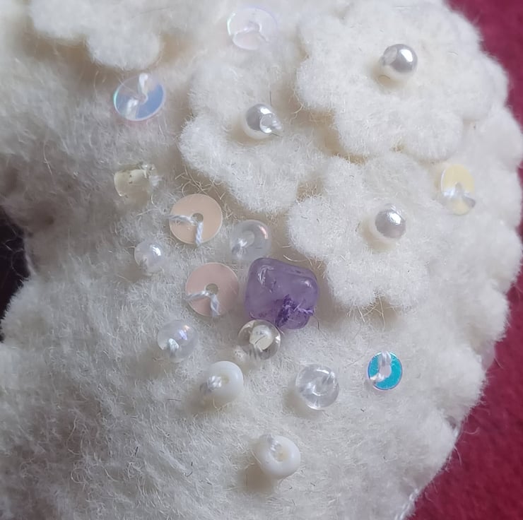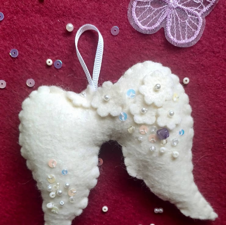 These exquisite decorations are crafted from soft, blended wool felt in a lovely off-white hue, making them ideal for angel wings. Sewn in are a selection of sequins, beads and angel aura beads.