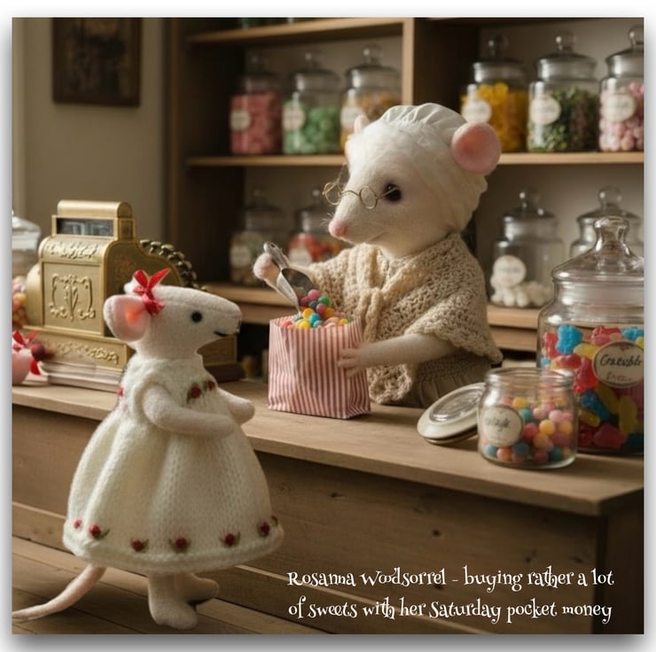 Rosanna Woodsorrel, in her knitted and embroidered ivory dress, is a Pip Squeak, a young Little Nippers from Mulberry Green. Little Nippers are tiny wood mice who live in a maze of tunnels underneath the barn at Mulberry Farm. All of the Little Nippers are named after herbs and meadow flowers. Sets of clothes, made especially to fit them, are also available in my shop. Pip Squeaks are 10cm tall.