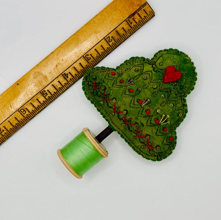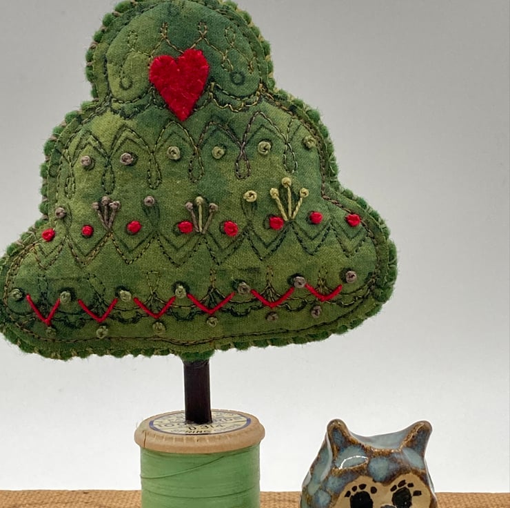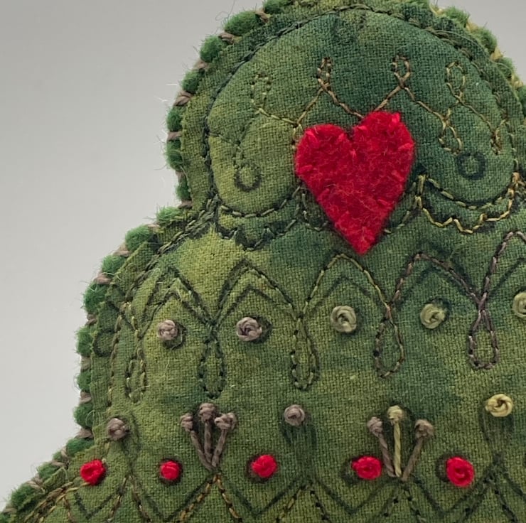 The tree is under printed with an antique French embroidery printing wheels I have and then lots of hand embroidery and a red felt appliqué heart, so sweet.