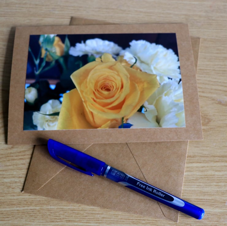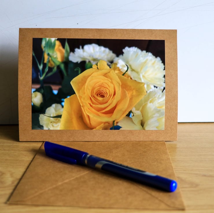 Celebrate the beauty of our garden blooms with this beautiful image of aYellow garden Rose, professionally printed and mounted on high quality Kraft card stock, blank inside for your own message. Perfect for birthdays, thank-yous, or seasonal notes or as Frameable art. Comes with a Kraft envelope. Please DM me if would like a larger print of this image.