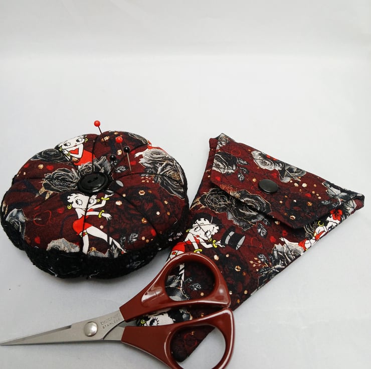 Pin Cushion and Scissor Case Betty Boop. A Unique Pin cushion and scissor case made from Betty Boop fabric. The Pin cushion has the same fabric on both sides and also features a button on both sides. The edge is embellished with black lace. The diameter of the pin cushion is 4". The quilted scissor case is 5.5" long and measures 4" across the top. The inside lining is black. This will make an ideal gift or perhaps treat yourself. A great addition for any Betty Boop Collectors. A perfect Mothers Day gift. If you let me know that you are purchasing for Mothers Day I will include a gift tag for you, as in images.