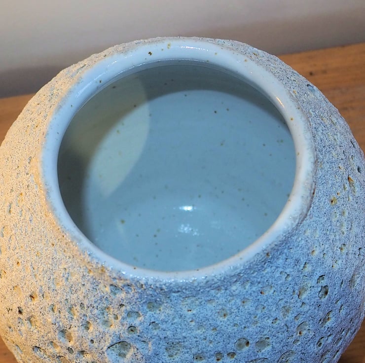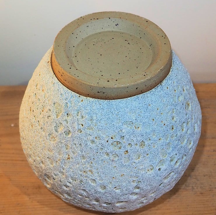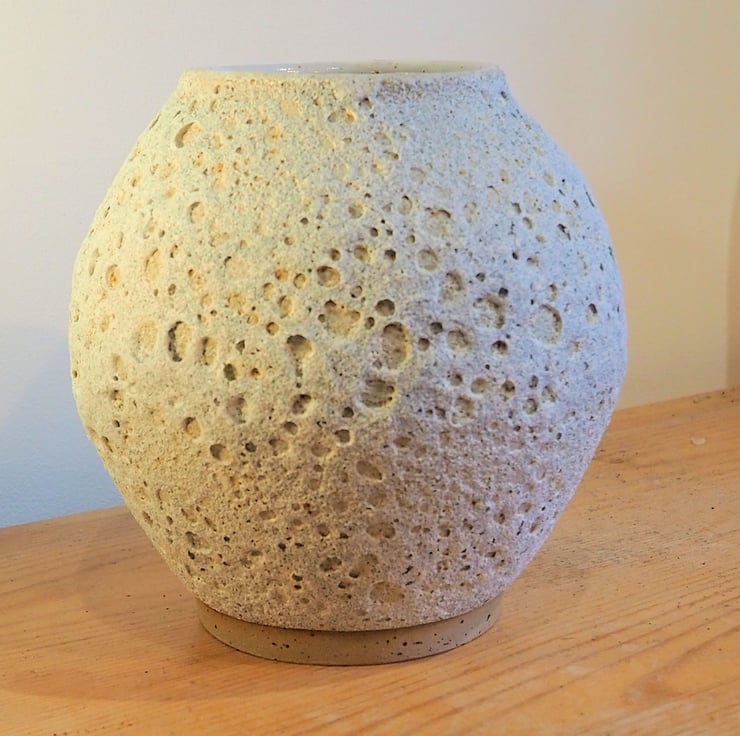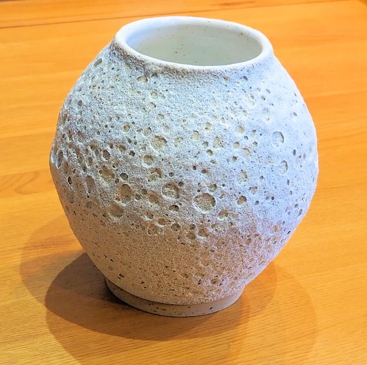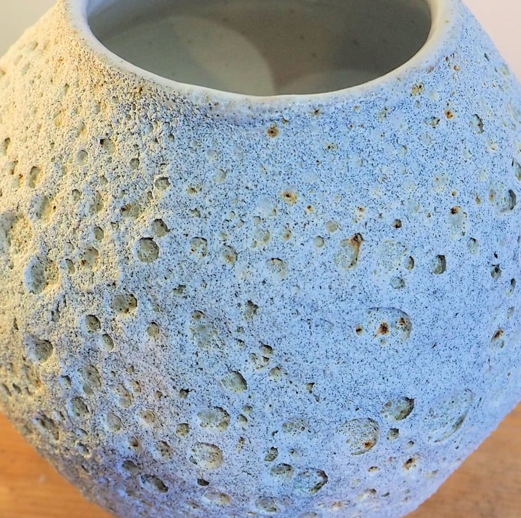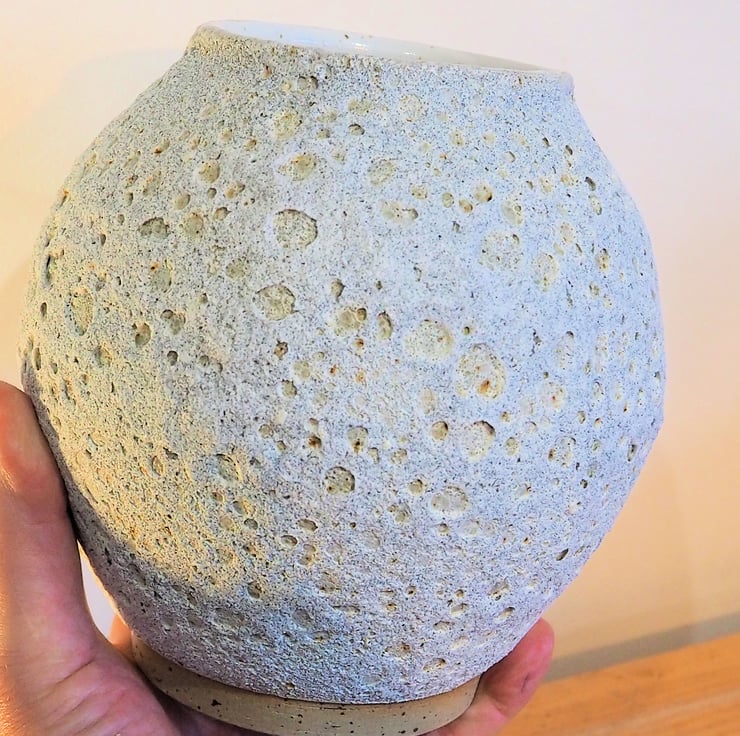 Stoneware pottery moon vase or jar. Hand made and thrown on my potters wheel. Finished in a white lava textured glaze creating a moonscape effect with craters and peaks.