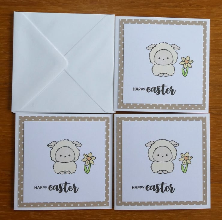 This pack of 3 mini Easter cards includes 3 cards with the same design of a cute sheep and a daffodil and the message Happy Easter.